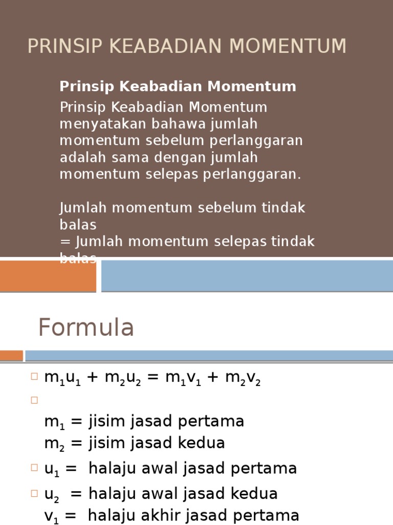 P momentum benda kg ms m massa benda kg v kecepatan benda ms Adanya perubahan kecepatan suatu benda menyebabkan perubahan. Maksud momentum dan alih bahasanya dalam bahasa Inggeris. Dalam mekanika klasik momentum dilambangkan dengan P ditakrifkan sebagai hasil perkalian dari massa dan kecepatan sehingga menghasilkan vektor.
